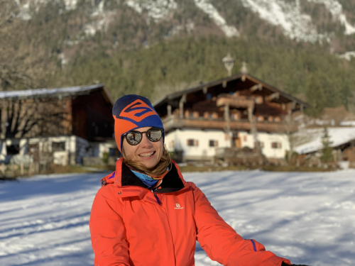 Austria Gemeinde Scheffau am Wilden Kaiser Winter Woman in sunglasses Chalet Alps