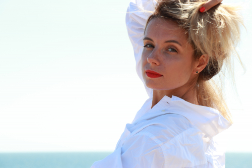Beautiful woman Woman In Shirt White shirt Black Sea Red lipstick Photo model