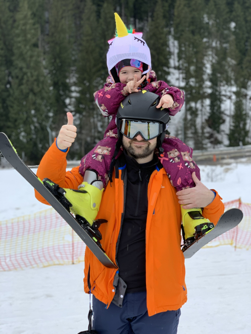 Ukraine Polianytsia Rural Council Bukovel Skier Winter Father and daughter Ski